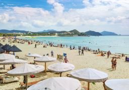 The beach lounge area of Dadonghai is imbued with a rich tropical atmosphere.