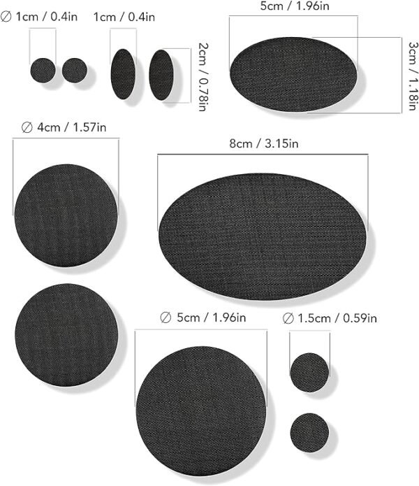 • 11 DIFFERENT SHAPES AND SIZES – each mending set includes 11 pre-cut, self-adhesive, high-quality patches (1 oval 3.15×1.9in, 1 oval 1.18×1.96in, 2 ovals 0.4×0.78in each, 1 circle 1.96in diameter, 2 circles 1.57in, 2 circles 0.59in and 2 circles 0.4in)