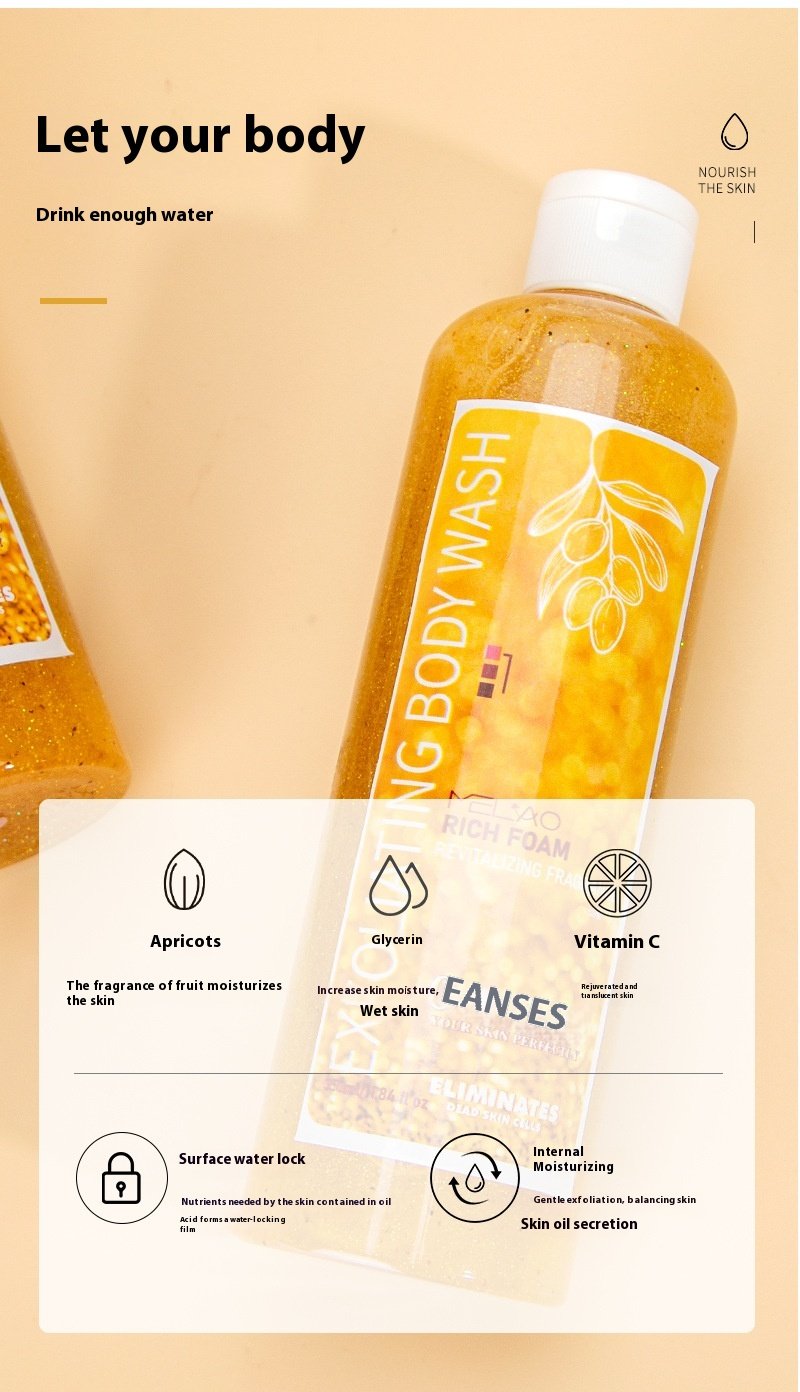 Product efficacy: Provides physical exfoliation, softens rough skin and reduces dullness, improves overall shine and soothes the body. Rich in vitamins C and E to make skin tone more even, almond seed extract tightens skin tone