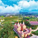 Encircled by lush greenery, the fragrant scent of lotus flowers fills the air, with trees flourishing and thriving, creating a picturesque landscape.