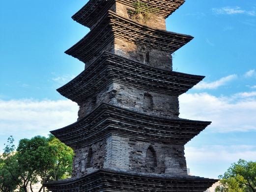 The pagoda of Tianning Temple is a brick structure with a parabolic elevation and a square plan, approximately 3.20 meters per side, consisting of five levels that contract progressively. Each level features an overhanging eave constructed with bricks, which extends further out compared to the common Tang dynasty pagodas in the north. The interior of the pagoda is cylindrical, with pot-shaped doors on all four sides of the ground floor, and niches on the walls of each subsequent level. The pagoda stands at about 12 meters tall, with a wall thickness of approximately 0.76 meters, covering an area of 10.42 square meters. The Tianning Temple Pagoda is one of the oldest existing Tang dynasty brick pagodas in Zhejiang Province and the only surviving example of a Tang dynasty temple’s twin pagodas in China, playing a significant role in the study of religious culture and Buddhist architecture of the Tang era. The western pagoda has been restored to its original appearance. In 2003, archaeological excavations were conducted at the Tianning Temple site, clarifying the layout of the temple to the east of the central axis during the Tang and Song dynasties, and it is now protected on its original site. The site is open to the public all year round, with full-day access.