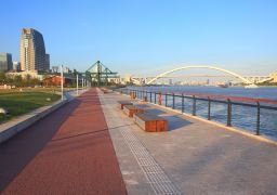 Xuhui Binjiang Avenue is located east to the Huangpu River, west to Fengxi Road, south from the China Aviation Oil Depot, and north to Rui Ning Road, with a total length of 3.6 kilometers. The Dapu Road Tunnel and Longyao Road Tunnel connect the Pudong World Expo Park with Xuhui Binjiang Avenue. The first phase of the project covers an area equivalent to four Xuhui Parks, with a public green space area of 140,000 square meters. The traffic system of the open space consists of a landscape avenue, leisure bicycle lanes, water-friendly walkways, and a lane reserved for future development. This area was originally the site of the Longhua Airport. Now, it has been transformed into broad avenues, and the riverside docks have been redeveloped into water-friendly landscapes. The avenue is shaded by lush greenery, illuminated by dimly lit artistic street lamps, and features wooden walkways extending into the river. There are also intentionally preserved iron bollards for mooring ships, old rubber rings, and cranes. Along the way, one can see historical remnants such as the cement plant’s pre-homogenizing silo, coal conveyor belt, Beipiao Dock crane, and Nanpu Station cargo warehouse. A water tower has been transformed into a large artistic white magnolia, radiating colorful light in the dark. The newly built Longhua Port Bridge is adorned with floodlights, presenting a dazzling array of colors. Strolling along the Binjiang Avenue, one can listen to the surging river, watch the shimmering waves, feel the gentle river breeze, admire the full moon, observe the river lapping at the shore, and gaze at the beautiful views of the World Expo Park.